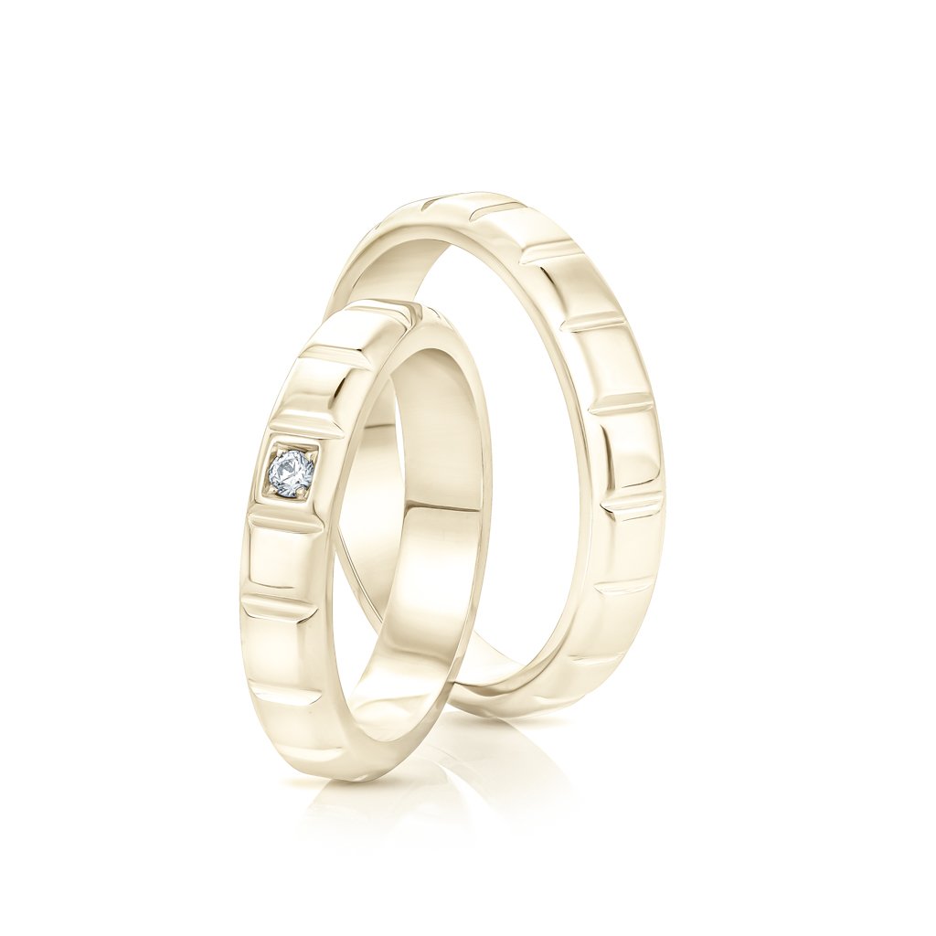 Nádherný pár ručne vyrobených svadobných obrúčok. Dominantná dámska svadobná obrúčka, a rovnako aj pánska, ktoré sa stávajú skvostom a jedinečným kúskom na vašich rukách. Ručne vsadené kamene po oboch okrajoch dámskej obrúčky dodávajú nádych luxusu. Pánska obrúčka je kombináciou lesku, matu a rýh. Svadobné obrúčky vám na mieru vyrobíme v bielom, v žltom, v ružovom zlate, v ich kombináciách, alebo v platine. Dámy si môžu vybrať zirkónovú alebo briliantovú verziu.